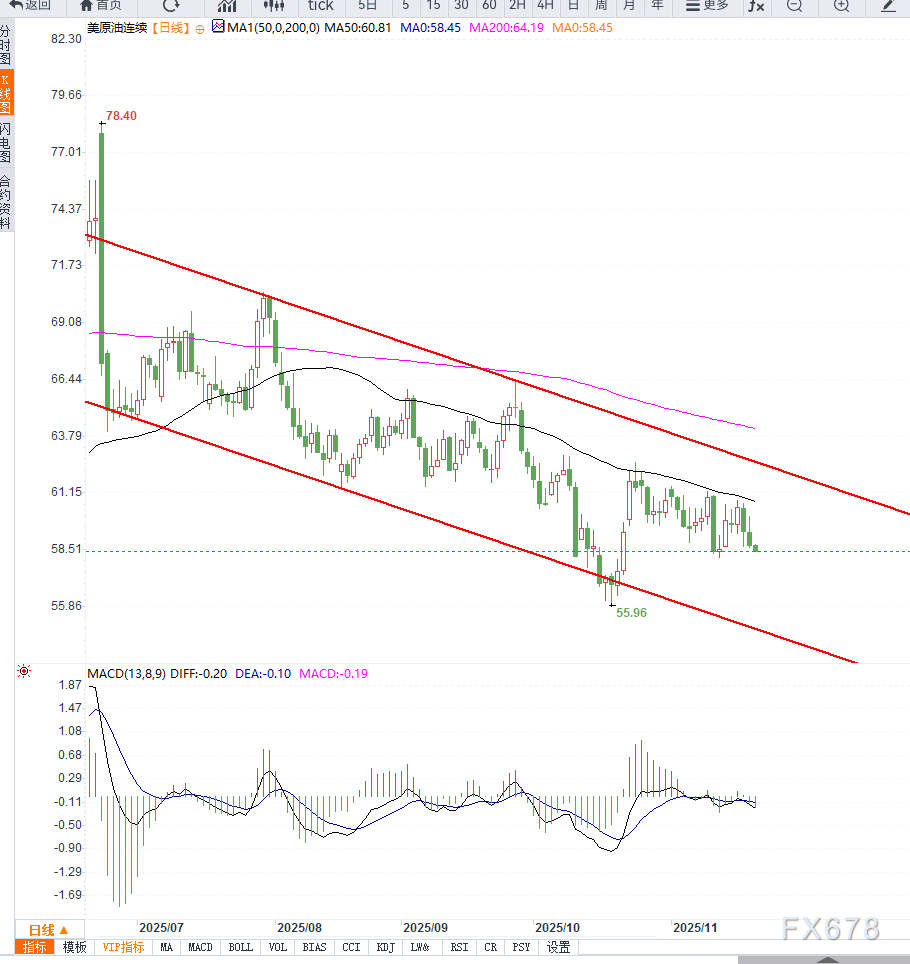 从日线级别观察,美原油价格近期持续在58至60美元附近形成弱势整理区间,K线结构呈现典型的震荡下移形态。短周期均线向下压制,价格多次在上方的9日均线附近受阻,显示短线反弹力度有限。