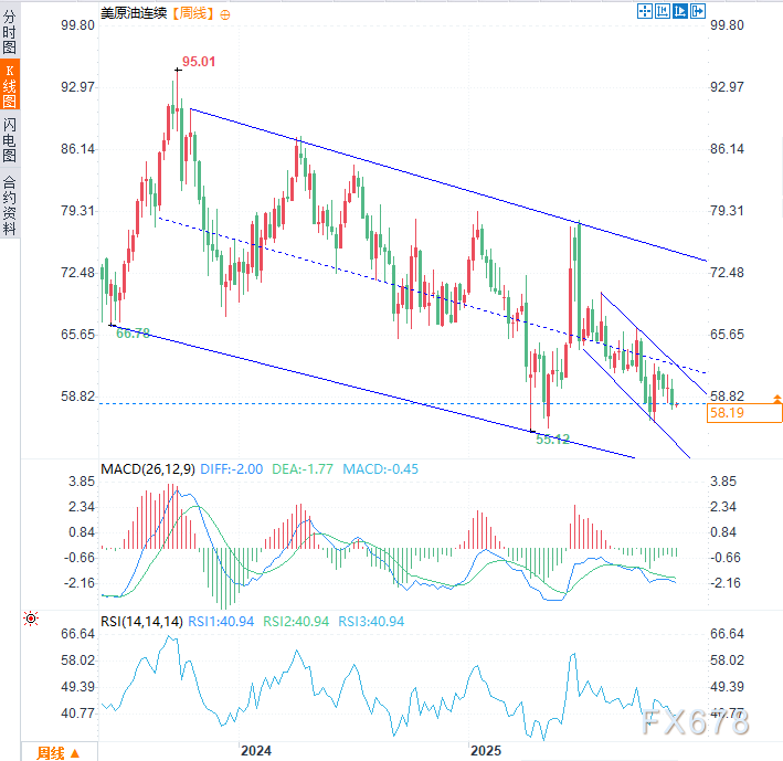 从周线图来看,原油整体走势仍处于2023年以来的主导下跌趋势中,而自2025年6月形成的短期趋势目前企稳于每桶55美元上方。
