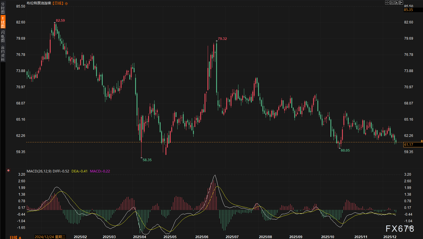 本周初,油价在相对低位开盘后试图寻找支撑,但市场情绪整体偏空。周中,美国方面关于在委内瑞拉沿海扣押受制裁油轮的消息一度引发供应担忧,推动油价短暂反弹。然而,这种地缘溢价并未持久,交易商很快将注意力转向更为宏观的供需格局。国际能源署(IEA)周四公布的悲观预测成为压垮市场的最后一根稻草,油价应声下跌,并在周五延续跌势,最终以接近周内低位的价格收盘。