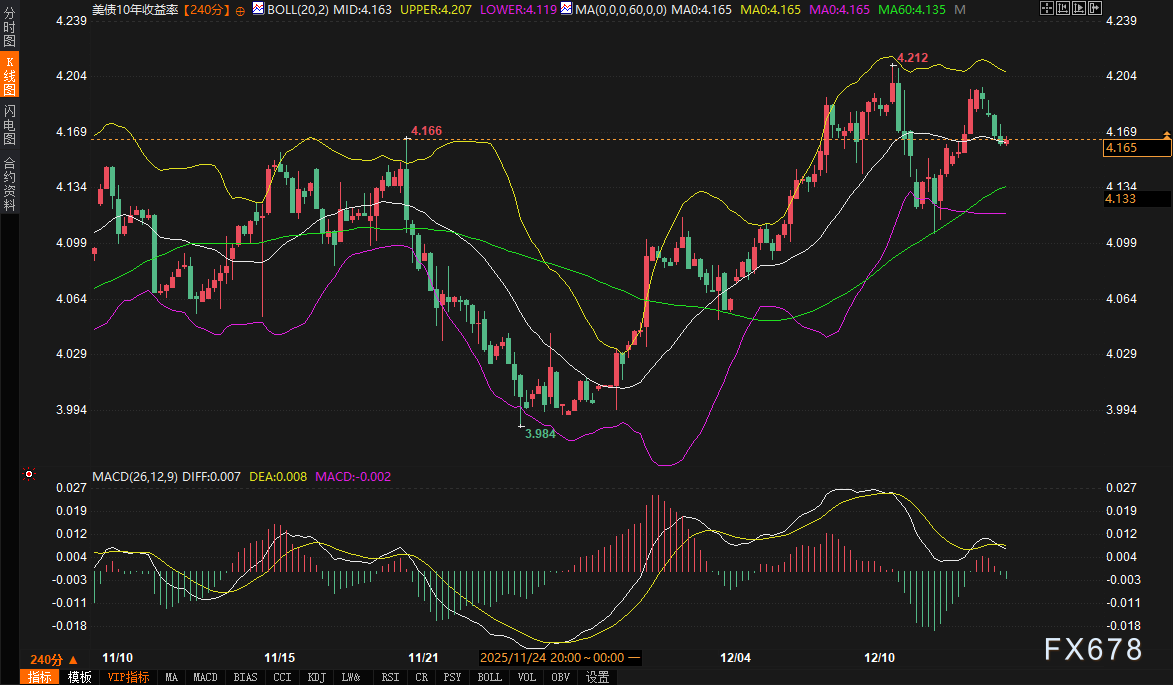 10年期美债收益率:支撑4.12%(布林带下轨),阻力4.21%(前高及布林带上轨)