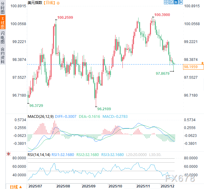 最终对美元的影响,将取决于哈塞特能否在质疑声中,以行动证明自己既能有效推行符合经济需求的政策,又能坚守美联储免受不当政治干预的制度底线。目前来看,围绕他的不确定性本身,就是美元面临的一个短期风险因素。周三亚市早盘时段,美元指数于98.20附近窄幅震荡,前一交易日一度触及97.87的10月3日以来低点。