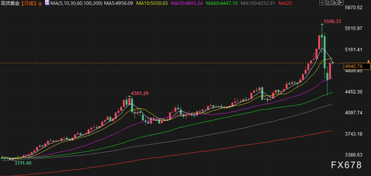 黄金与白银价格周二强劲反弹,金价创下自2008年11月以来的最大单日涨幅,现货黄金上涨超6%,至每盎司4993.27美元,从周一的低点大幅回升。